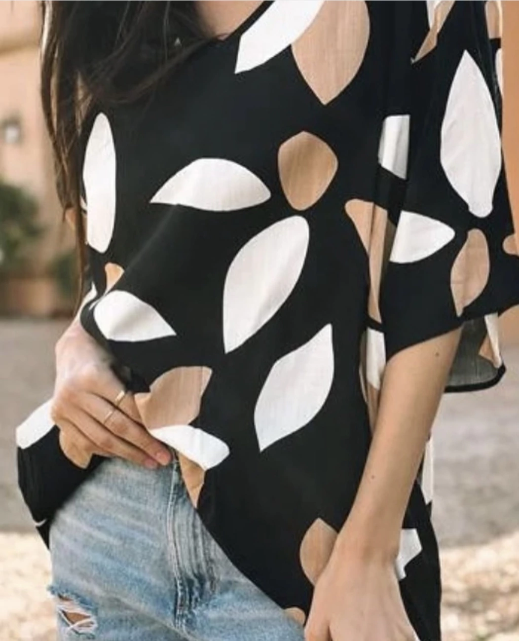 Su estampado moderno y sus tonos neutros la convierten en una prenda versátil, ideal para combinar con jeans, shorts o pantalones de lino.